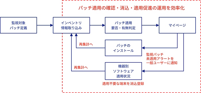 監視対象のパッチ適用状況を評価します。不足がある場合は一般ユーザーに通知されます。