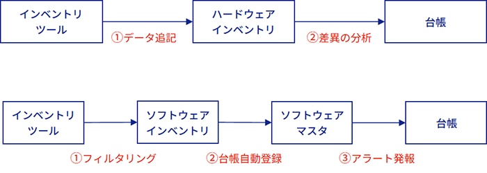 ハードウェアのインベントリ情報と台帳情報を比較し、台帳の不備を検出。