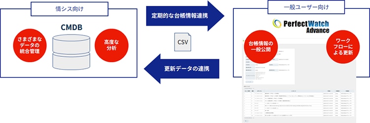 CMDBと連携してPerfectWatch Advanceで台帳データの最新化が可能です。